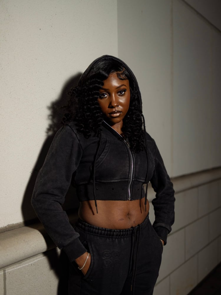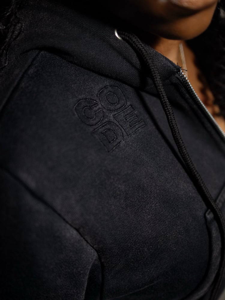 Cropped black acid wash zip up hoodie set with brain outline on hood and rhinestone waist detailing